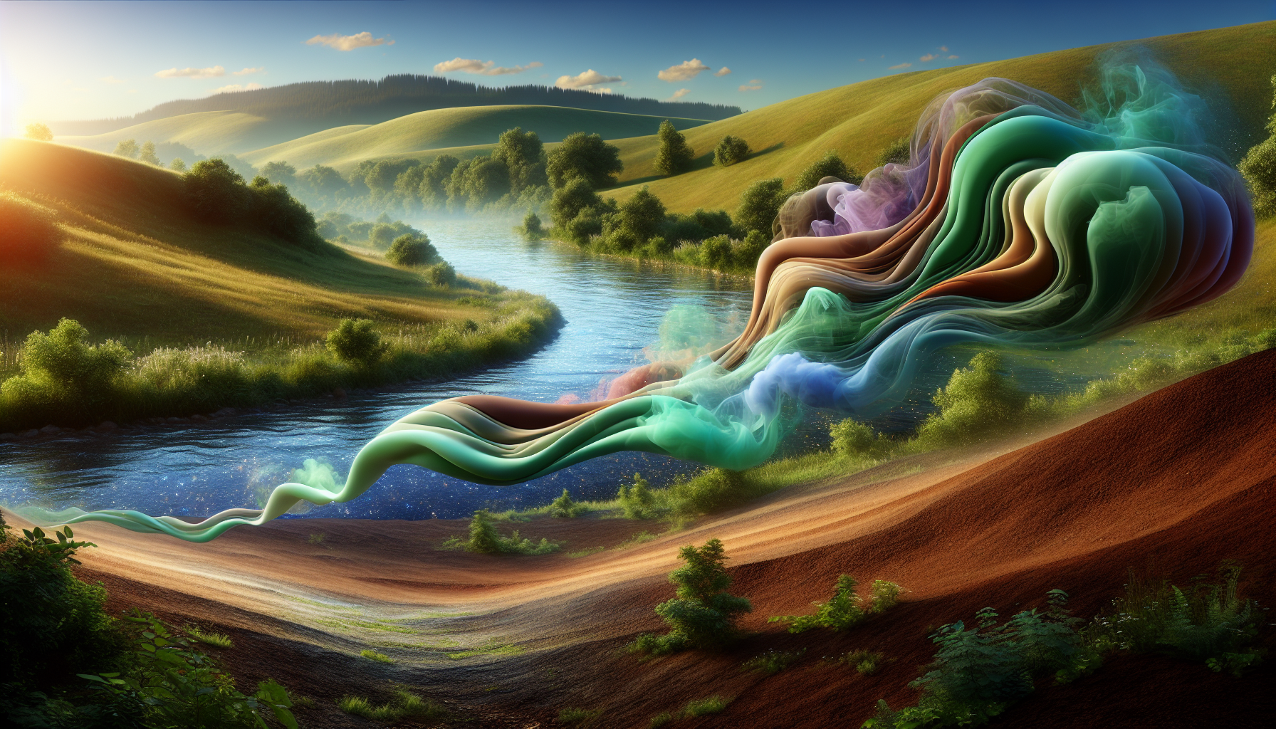 #161 — Aquarell einer Frühlingslandschaft, Justitia gibt ihre Bürde ab und schreitet in den Sonnenuntergang