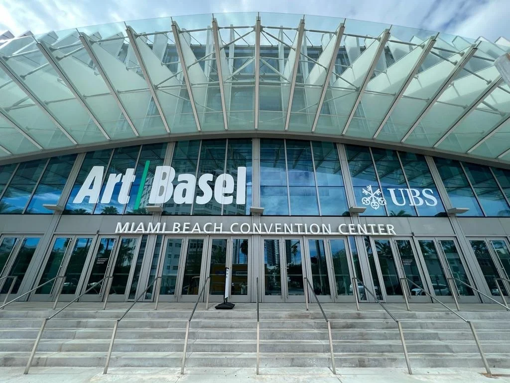 Exterior view of the Miami Beach Convention Center with large glass windows and signage for Art Basel, UBS, and Miami Beach Convention Center